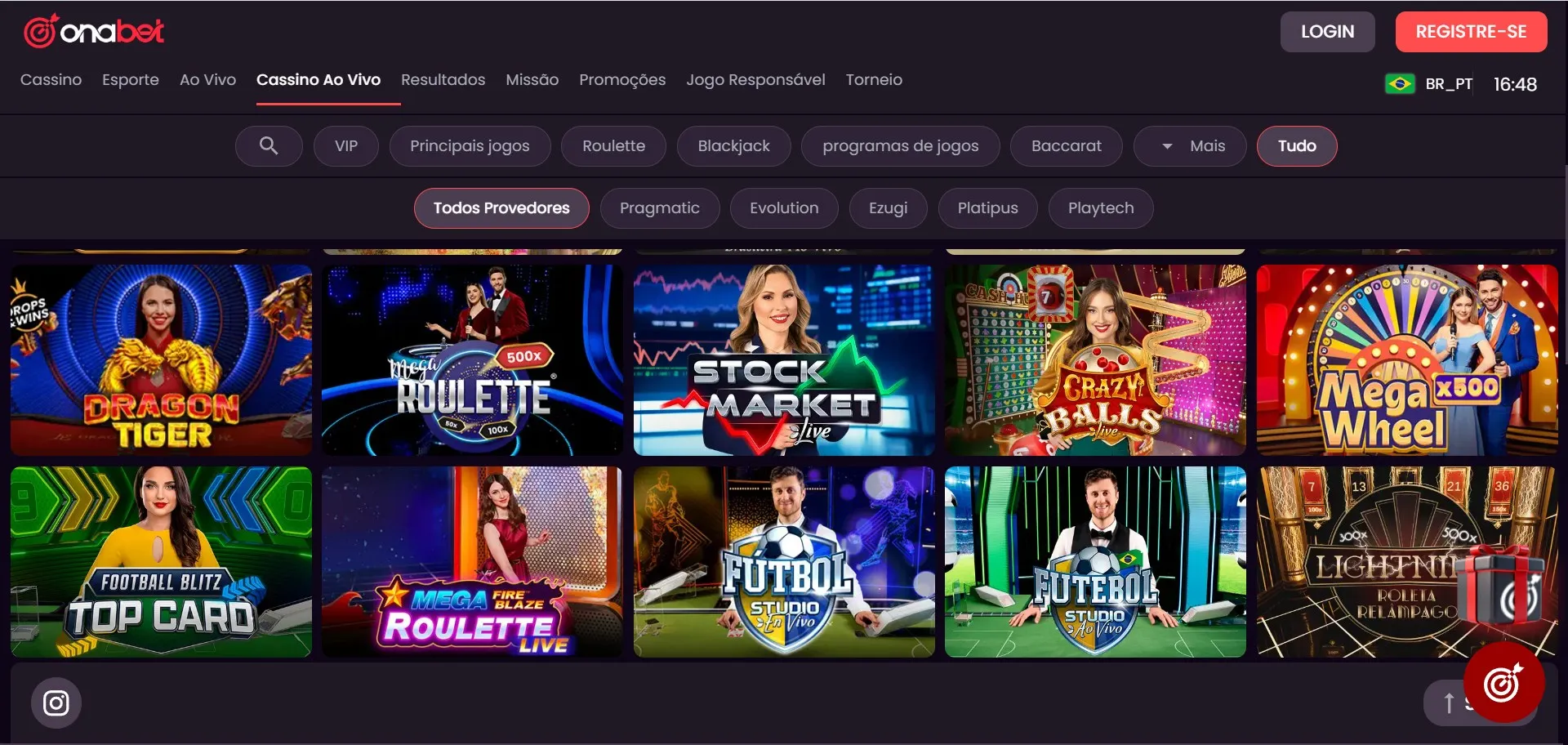 O segmento onabet com casino inclui mesas ao vivo integradas principalmente via Pragmatic Play Live.