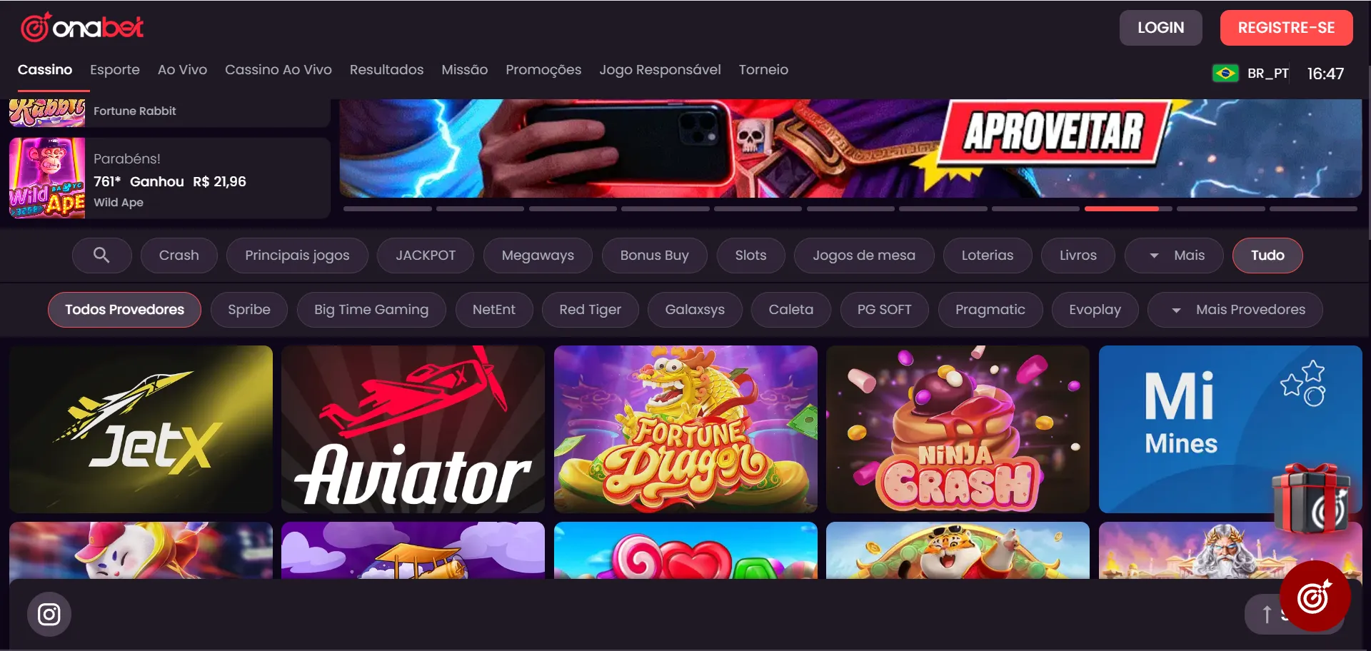 A Onabet lista provedores conhecidos como PG Soft, Pragmatic Play, Spribe, NetEnt, Red Tiger, Evoplay, Galaxsys, Caleta e Big Time Gaming. Nossa equipe encontrou categorias como slots, crash games (ex.: Aviator), live casino e jogos de mesa; a disponibilidade de títulos (Fortune Tiger, Mines) pode variar por catálogo.